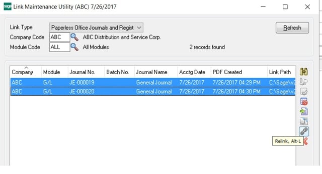NOTE: This interface can handle a maximum of 100,000 records. If there are more than 100,000 records for one time, the Viewer will have to be used to re-link the records using the date filter which Link Maintenance does not have. It is recommended that PDF’s are purged regularly as well if this number exceeds 75,000 records (Paperless Office, Utilities, Purge PDF Documents)